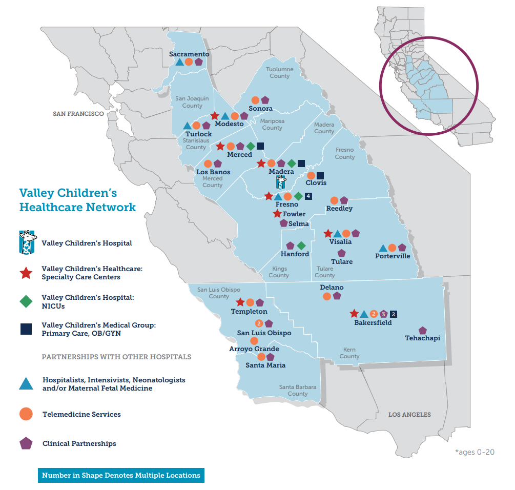 Valley Children’s Hospital offers pediatric subspecialty medical and surgical care on every level, serving California's Central Valley, a 45,000 square-mile region. The hospital has state-of-the-art Pediatric Intensive Care Unit, Neonatal Intensive Care Unit, and maternal-fetal medicine services.